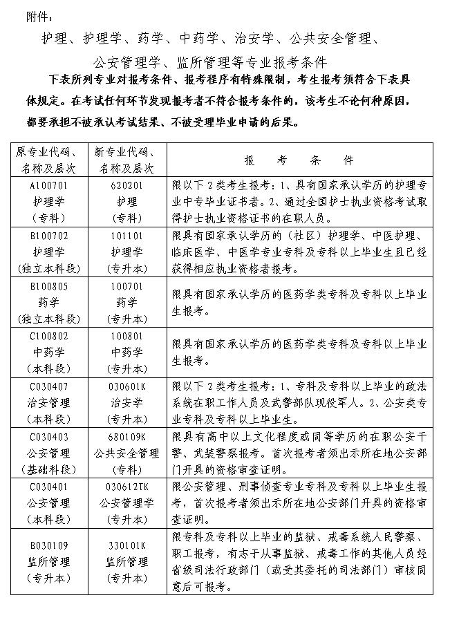附件:护理、护理学、药学、中药学、治安学、公共安全管理、公安管理学、监所管理等专业报考条件